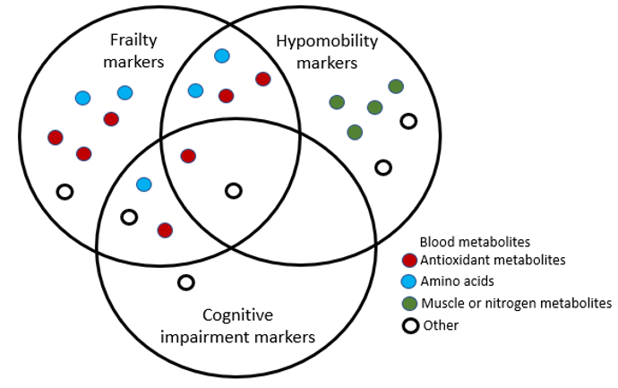 Figure 1. A Venn diagram showing how different metabolites relate to different age-related disorders. 22 different blood metabolites correlating to frailty, cognitive impairment and hypomobility were discovered. Although some of these metabolites were relevant to more than one disorder, frailty was found to have a distinct metabolomic profile.