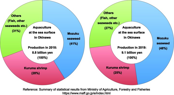 Kuruma Shrimp are an important aquaculture product in Okinawa, second only to mozuku seaweed. This graph appeared in the press release “New research provides useful genetic resource of farm-raised kuruma shrimp".