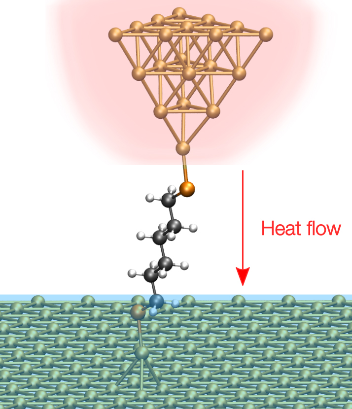 Researchers on a paper recently accepted by Nature are the first to successfully measure and explain the transport of heat at the molecular scale. The figure shows a hot gold probe tip being held above a cold gold substrate in such a way that the alkane molecule forms a link between them.  Heat then flows from the hot tip to the cold substrate through the single molecule.