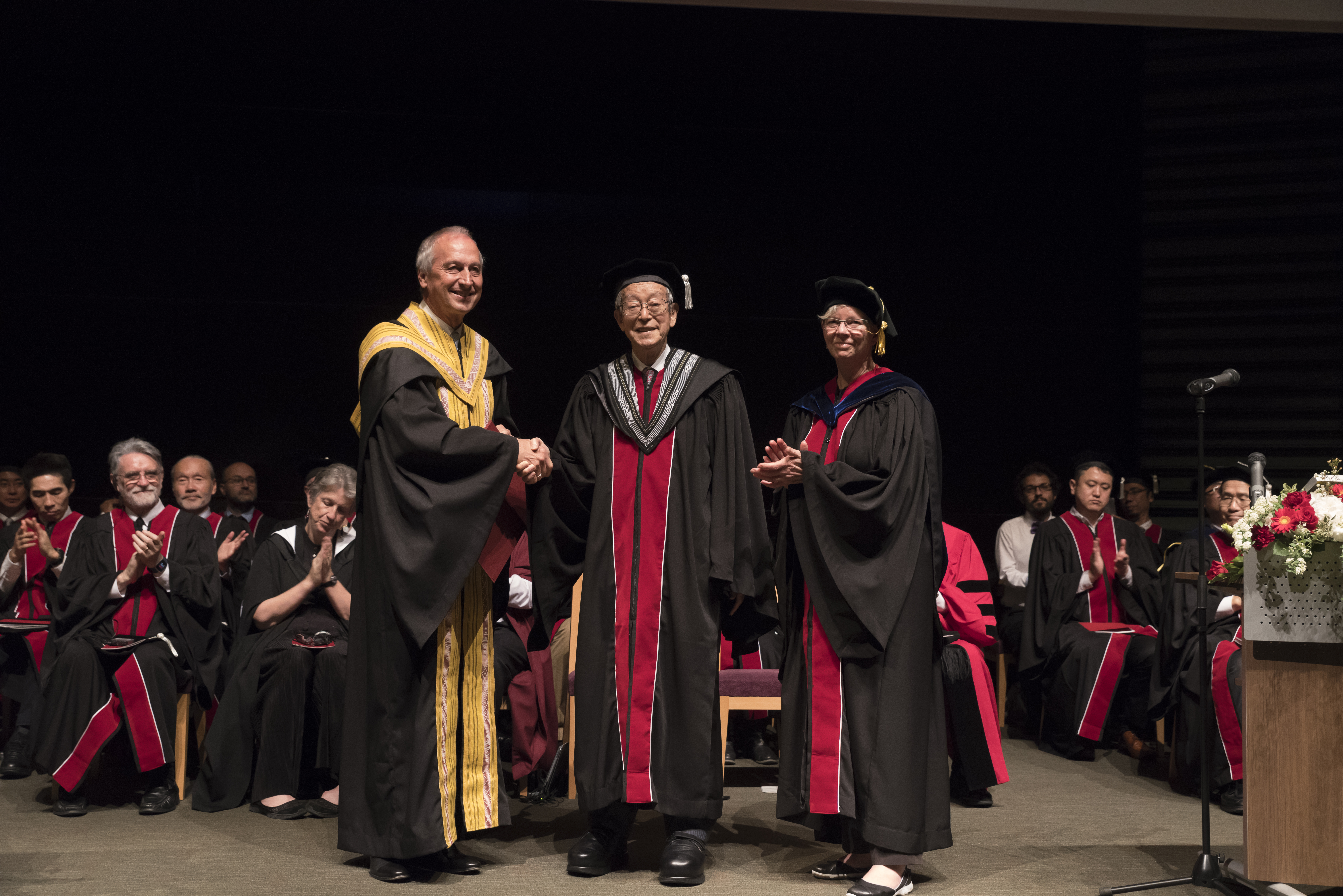 In honor of his efforts and achievements, OIST awarded Mr. Koji Omi its first honorary doctorate degree at the first graduation ceremony in 2018.