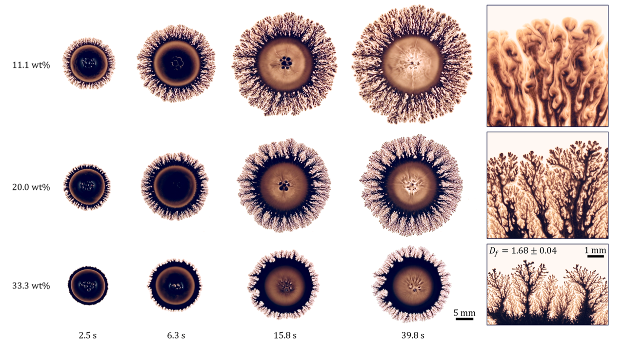 Snapshots of the ink droplets containing 50 vol% alcohol (isopropanol) as they spread on a surface coated with 400 μm-thick acrylic paint with different paint concentrations (11%, 20% and 33%), captured over approximately 40 seconds. The images on the rightmost column show the zoomed-in views of the droplet edges. Higher paint concentration leads to increasingly refined and fractal-like droplet edges.