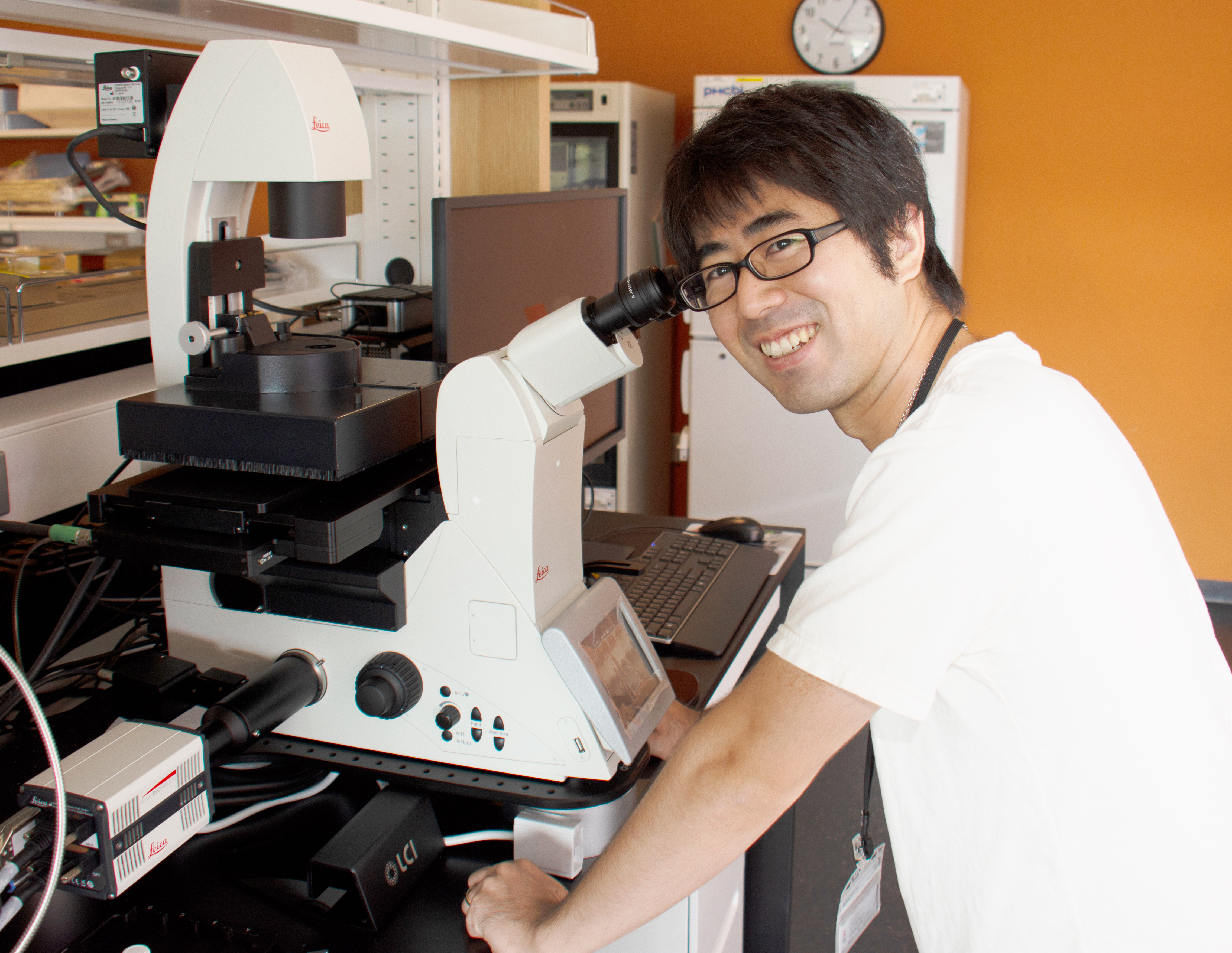 Professor Kazumasa Tanaka examines a sample through a microscope in his new lab at OIST.