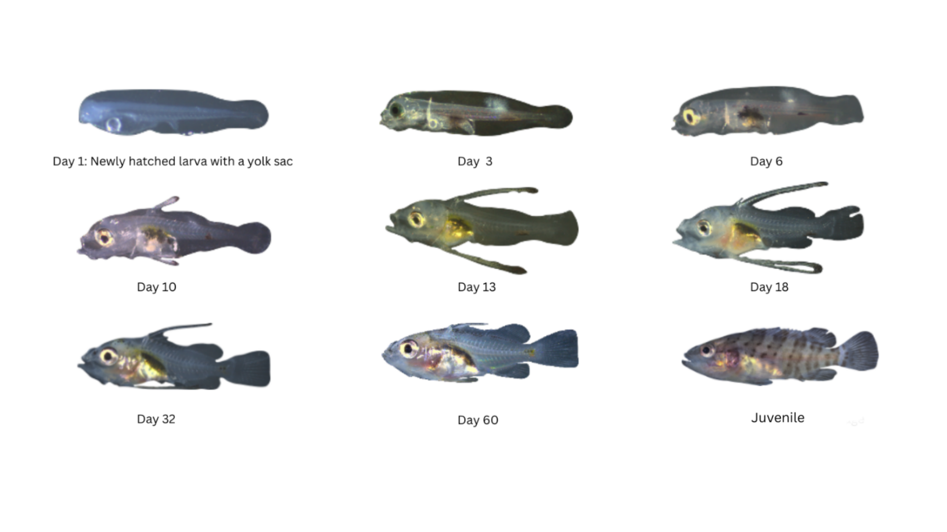 Larval and juvenile Malabar groupers at various developmental stages. These specimens were used for RNA analysis to map gene activity and expression patterns throughout the fish's early life cycle.
