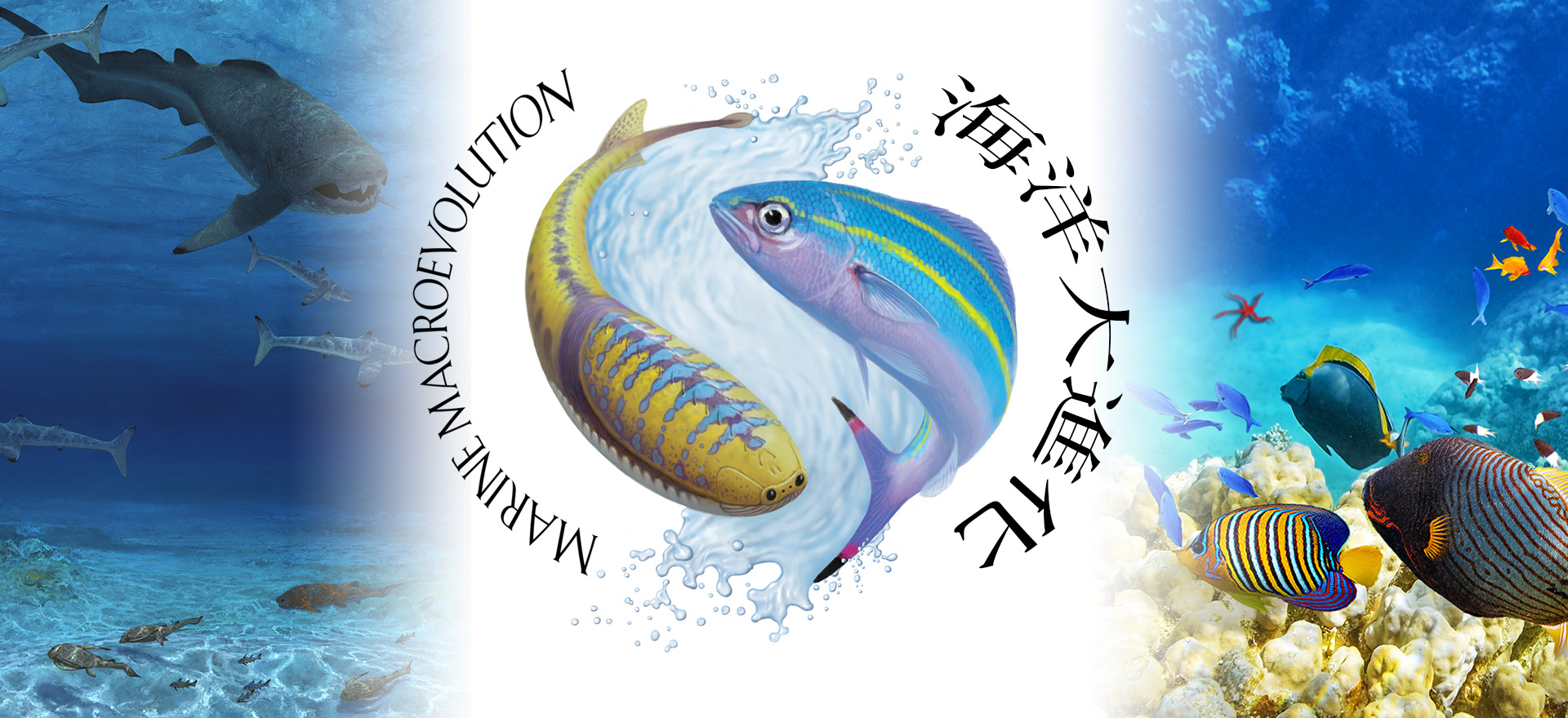 Logo for the Marine Macroevolution Unit, featuring the early jawless fish Sacabambaspis and the Okinawa prefectural fish, the Gurukun (Caesio diagramma)