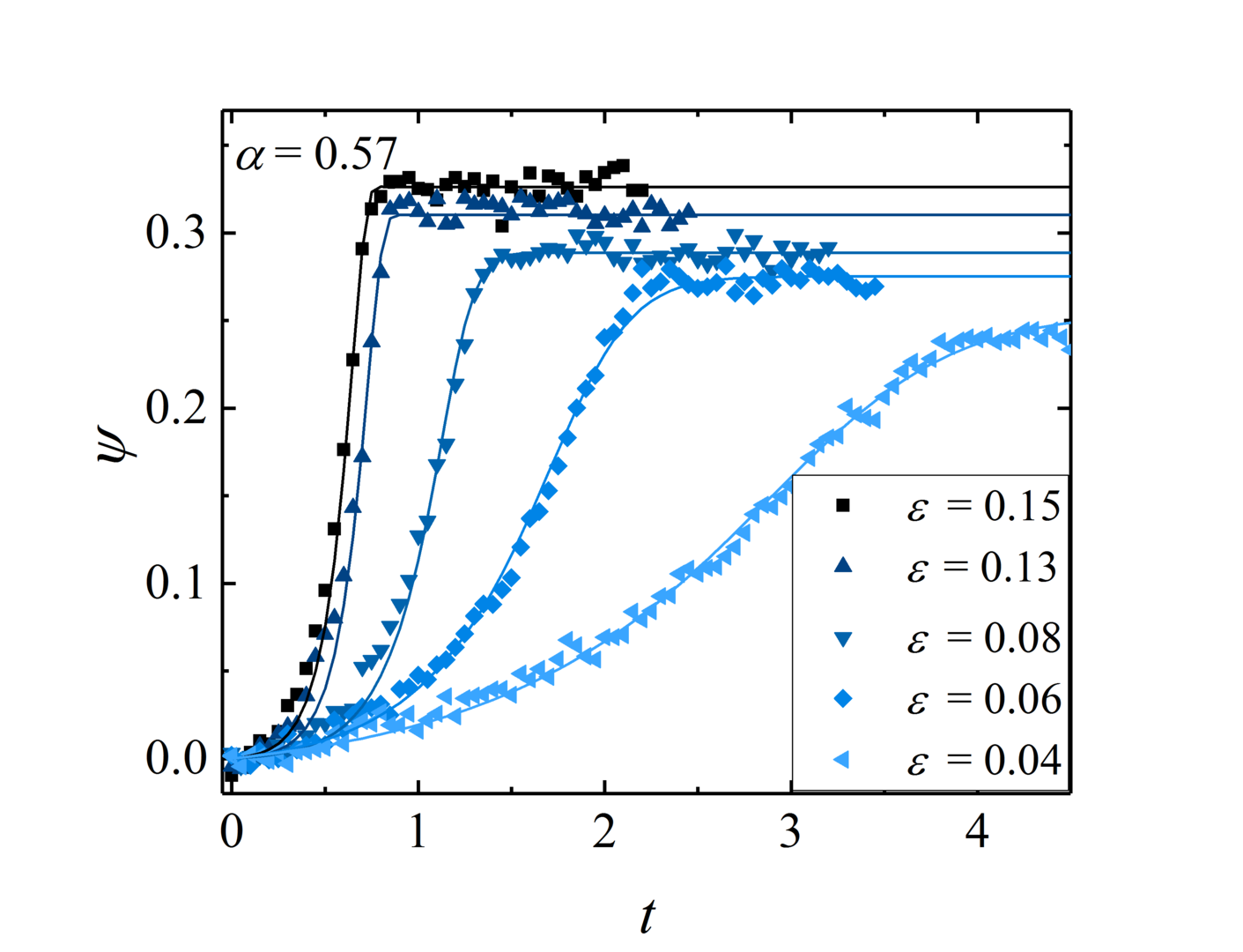 Figure 2: growth of vortex intensity ψ plotted with time, t. The transition slows down as the control parameter ε is decreased to values that are closer to the critical point where ε = 0.