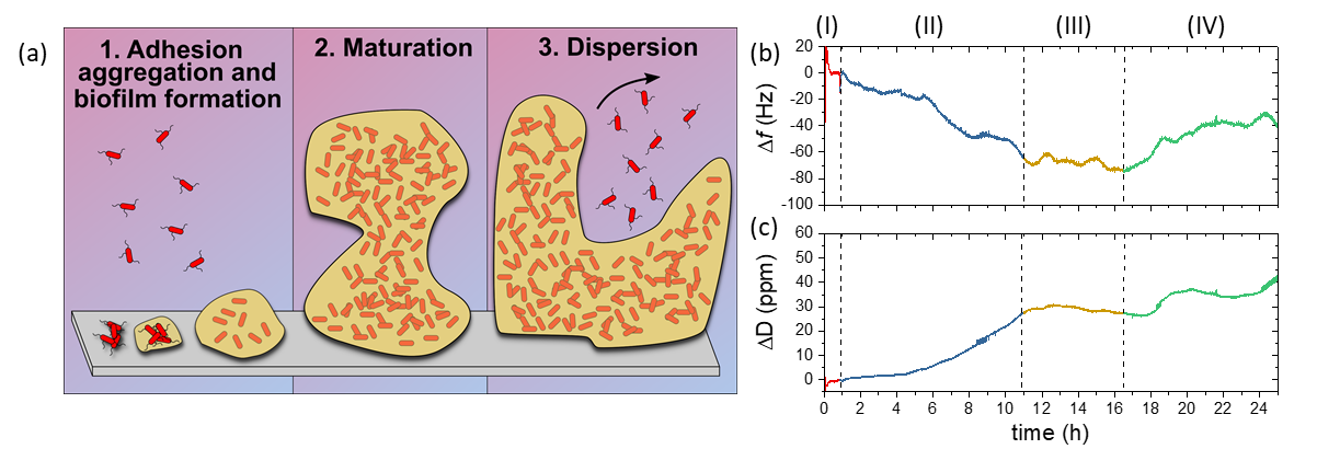 Figure 13: (a) Stages of biofilm development. Bacteria appendages drive cell adhesion onto solid surfaces (1). This interaction is stabilized by the production of extracellular polymeric substances (EPSs), which improve the attachment and offer both mechanical and chemical protection for the bacteria. Biofilm growth and maturation (2) is followed by the release of free-floating bacteria for further colonization (3). (b) Frequency and (c) Dissipation QCM sensorgrams of E. coli growing on gold. The color scheme highlights the stages of the experiment: initial stabilization with culture medium [red, (I)], biofilm formation [blue, (II)], maturation [yellow, (III)], and release of free planktonic cells [green, (IV)].