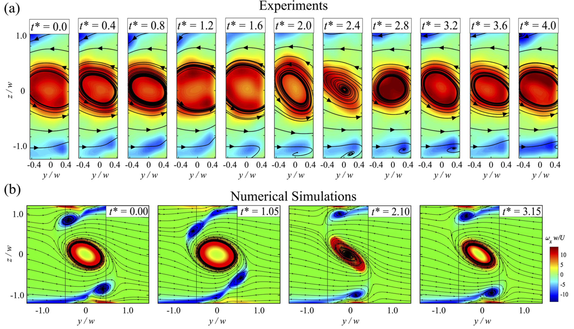 Fig. 6: Streamwise vortices formed at intersections undergo periodic variations if Re > Rec: (a) experimental measurements, (b) numerical simulations.