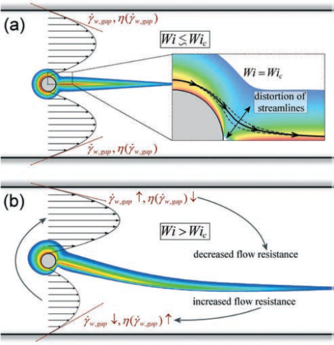Fig. 2: Schematic illustration of the instability mechanism for asymmetric flows of shear-thinning elastic fluids around cylinders. Coloured regions are indicative of the FIB measured in experiments, or the principle stress difference obtained from numerical simulations. (a) Symmetric flow at Wi ≲ Wic and (inset) perturbation of symmetric flow due to the onset of elastic instability at Wi = Wic. (b) Situation in the asymmetric flow state where a positive feedback loop (indicated by grey arrowed lines) leads to growth of the instability for Wi > Wic.