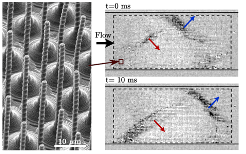Figure 3: Microfluidic canopy flow device, formed from a large array of slender polymeric pillars within a glass microchannel, is subjected to viscoelastic flow in the regime of elastic turbulence. The system results in the spontaneous emergence of waves in the form of propagating regions of low flow velocity compared to the bulk, also inducing Monami-like waves in the canopy if the pillars are flexible. Due to the analogies with classical (inertial) canopy turbulence, this new phenomenon is named “canopy elastic turbulence”.