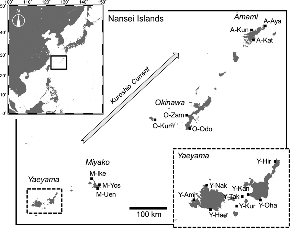 Figure 1: Collection sites for Galaxea fascicularis in the Nansei Islands in southwestern Japan