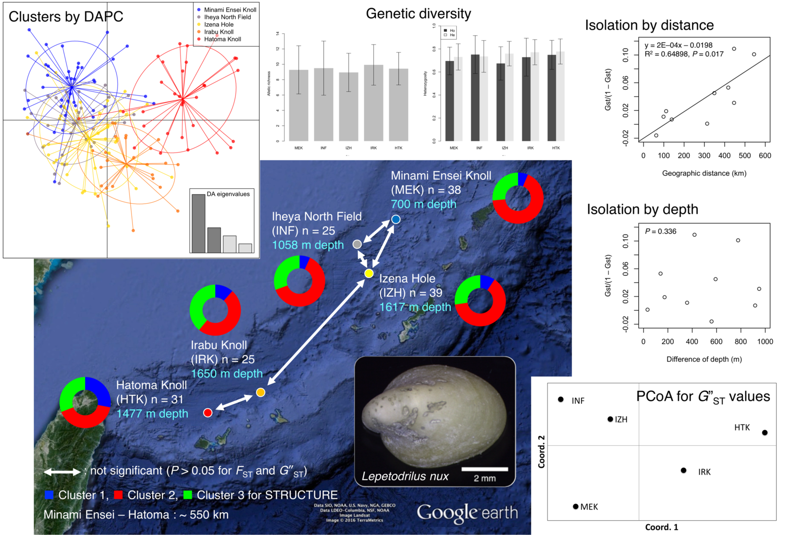 Figure 1: Genetic diversity has been maintained each vent site and genetic differentiation is low between most populations (FST = –0.003–0.023, G”ST = –0.016–0.098), but significant between distant vents in Lepetodrilus nux. Genetic structure was confirmed among vent sites, and different clusters were identified by DAPC. Each population is maintained by “stepping-stone” connectivity within the Okinawa Trough, regardless of the depth. Details about microsatellite markers are provided in Nakajima et al. (2017).