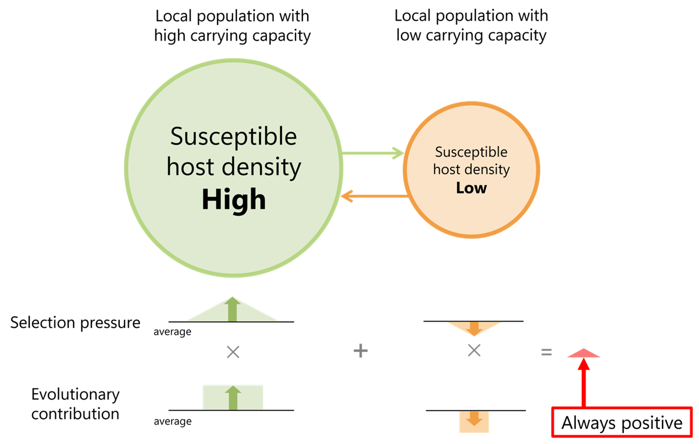 Figure 3: Heterogeneities in local environments create heterogeneity in the densities of local host populations. The left population is “resource-rich” for pathogens, as it offers a higher density of susceptible hosts, while the right population is “resource-scarce”, as it offers a lower density of susceptible hosts. For higher susceptible-host densities, more virulent pathogens are favored, while for lower susceptible-densities, milder pathogens are favored. Crucially, the net effect of these selection pressures across the metapopulation is not balanced, as the resource-rich population makes a more significant evolutionary contribution than the resource-scarce population, causing evolution to drive up pathogen virulence and infectiousness.