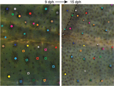Illustration of manual melanophore tracking in clownfish skin. Images of clownfish skin were taken every 24 hours and prominent melanophores were selected, labeled with distinctly colored and shaped symbols, and followed over extended periods of time. The example shows a 9-day old clownfish on the left and the same fish at 15 days on the right.