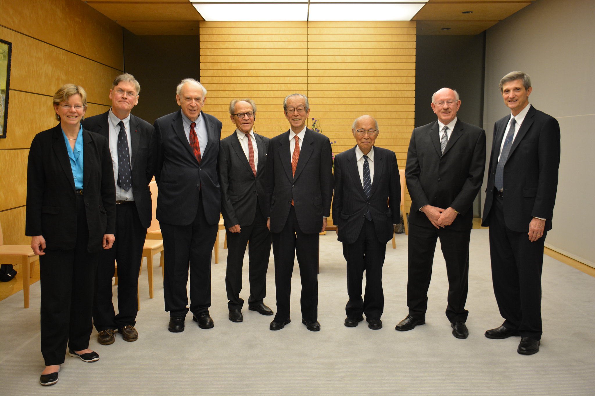 The members of OIST BOG visited Prime Minister Shinzo Abe in October 2013. From left: Dr. Cherry Murray, Dr. Tim Hunt, Dr. Jerome Friedman, Dr. Torsten Wiesel, Mr. Koji Omi, Dr. Akito Arima, Dr. Jonathan Dorfan and Dr. Robert Baughman.