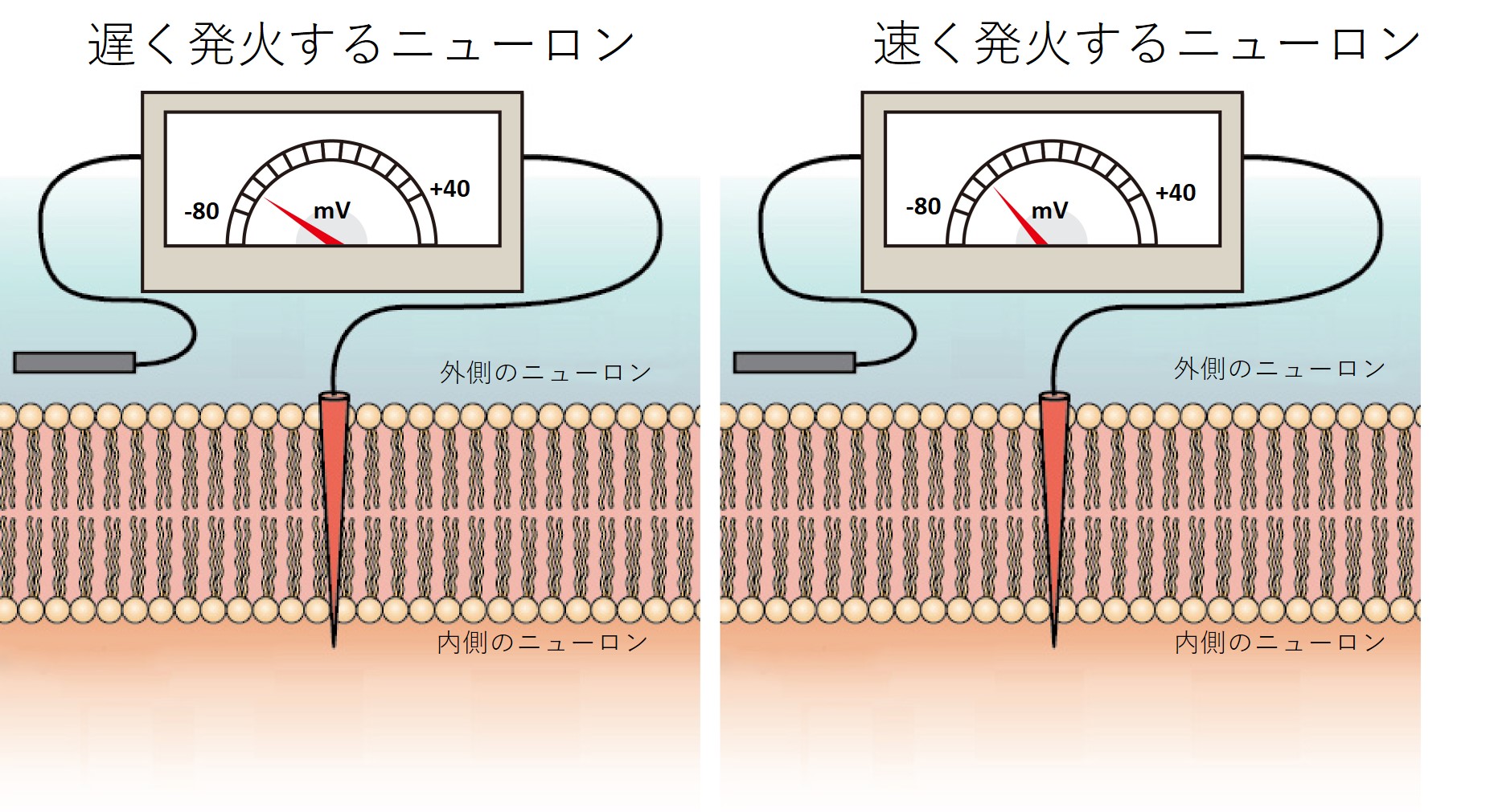 Cell membranes have a voltage across them due to the uneven distribution of charged particles, called ions, between the inside and outside of the cell. Neurons can shuttle ions across their membrane through channels and pumps, which changes the voltage of the membrane. Fast firing Purkinje neurons have a higher membrane voltage than slow firing neurons.