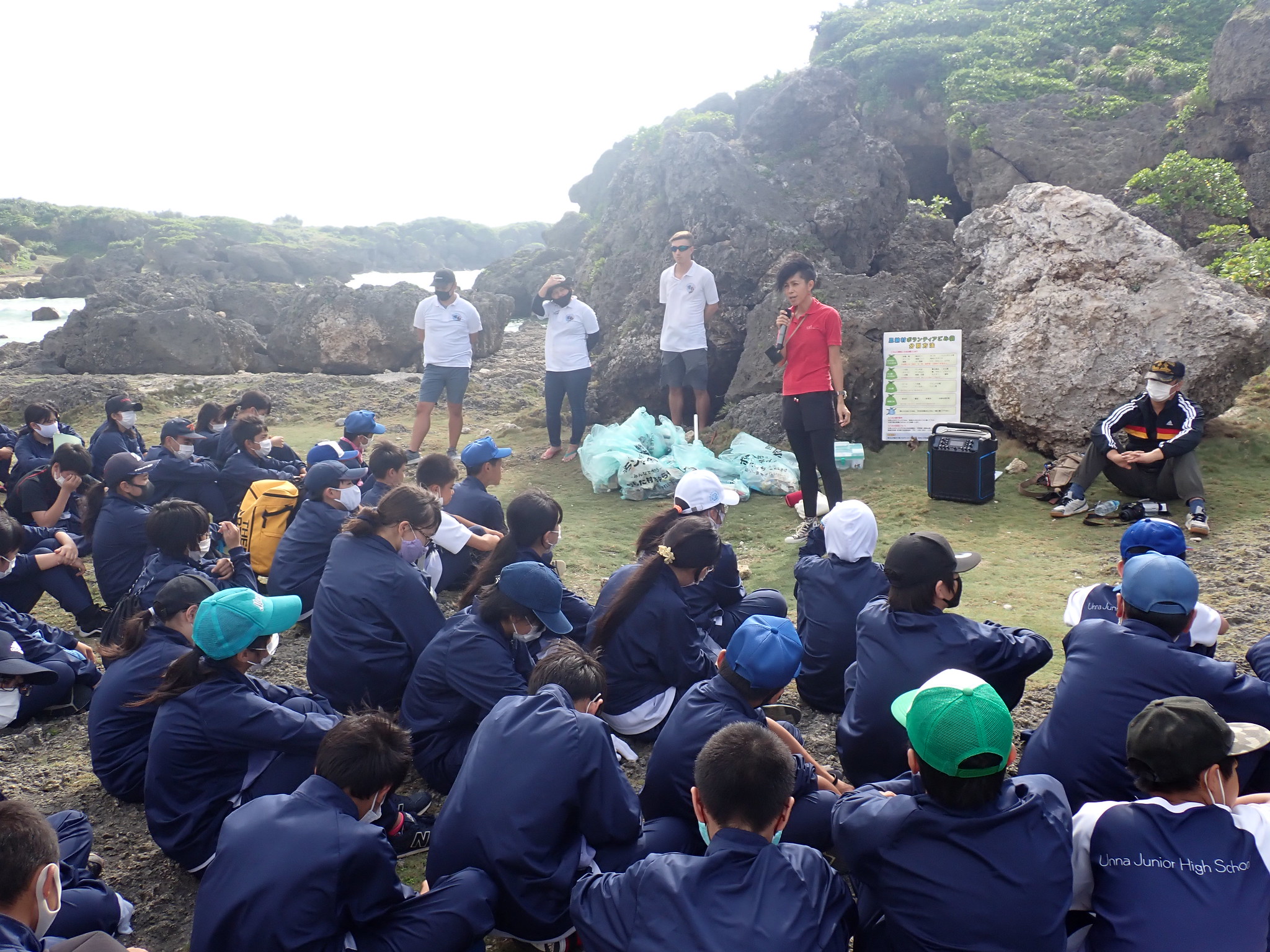 Meria Miller gives a lecture to junior high school students in Onna Village.