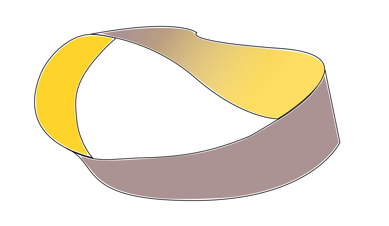 When two Möbius strips (pictured) come together, they form a Klein bottle, an unusual bottle-like object, which intersects with itself.