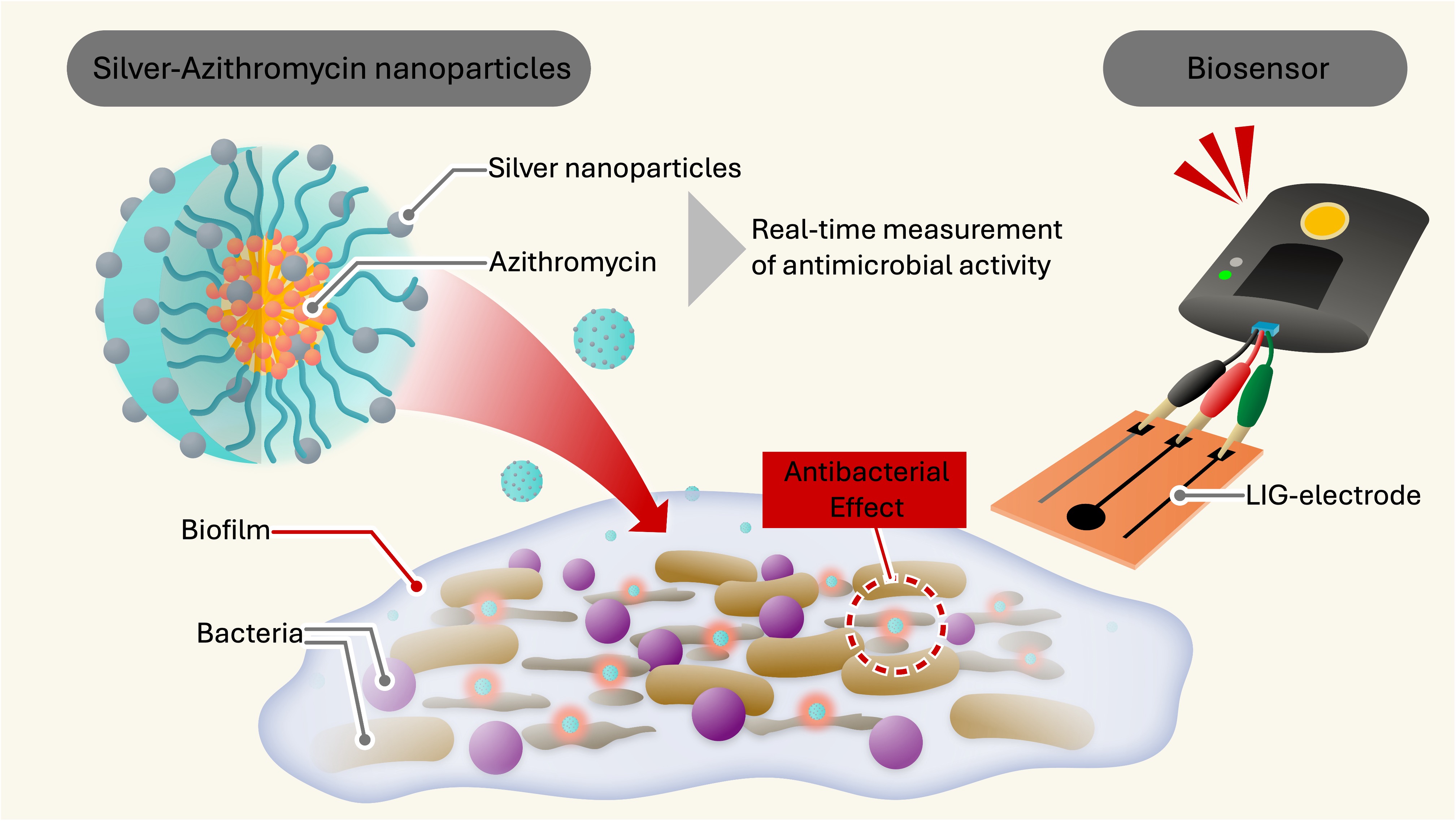 Silver nanoparticles, combined with a conventional antibiotic drug and stabilized by a polymer, work together to damage the cell walls of bacteria within biofilms. Image credit: National Institute of Advanced Industrial Science and Technology (AIST).