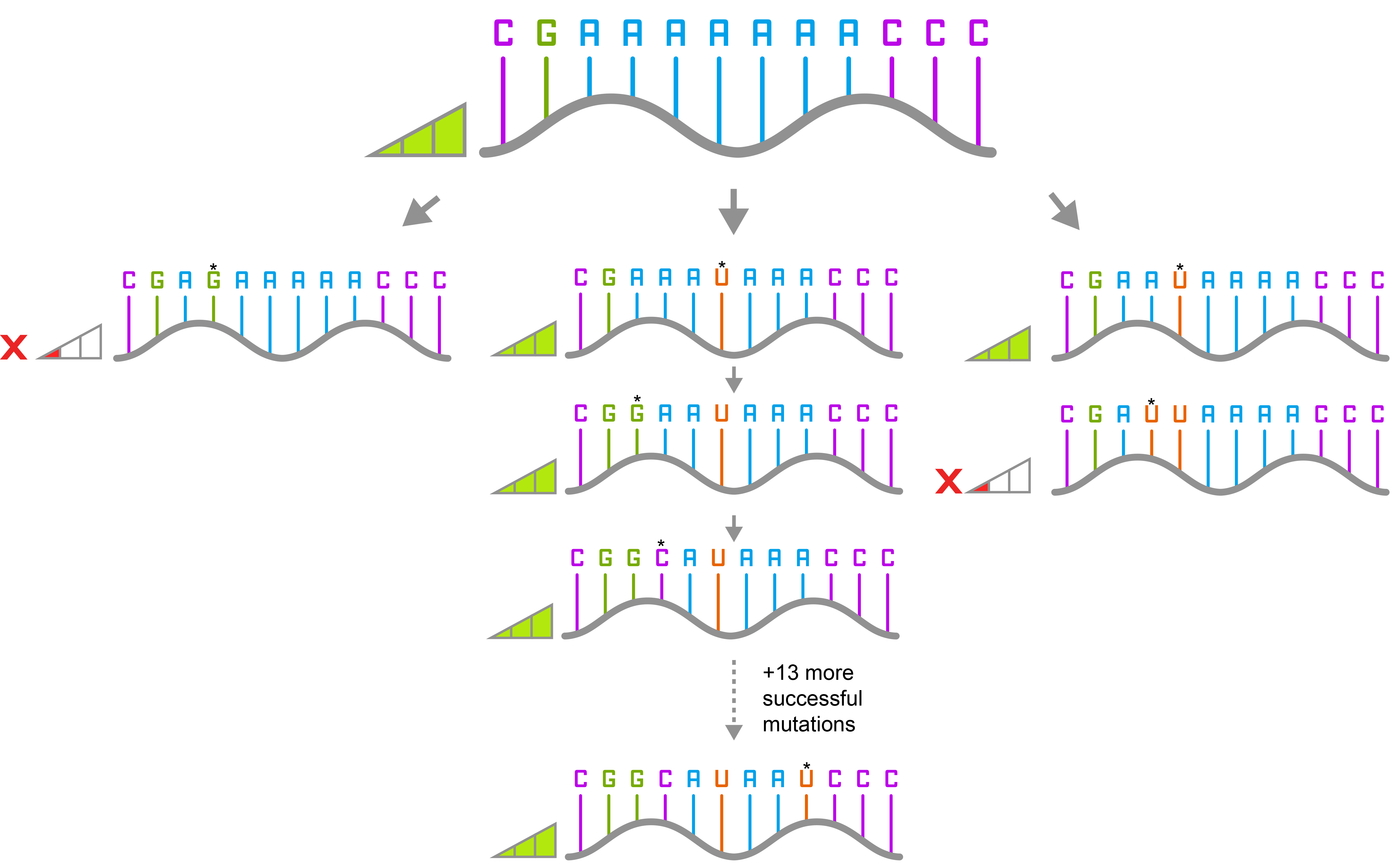 Mutations must maintain a similar fitness level compared to the one before and after them if diversity is to increase. If the mutation negatively impacts the variant, then the pathway to reach other variants will not be accessible. The above image shows a short sequence and the mutations that come from it. As can be seen, either the mutations maintain the same fitness level as the one before them and go on to form new mutants, or they are of lower fitness level and die out. Please note that the sequence is just an example and does not specifically relate to this research.