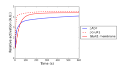 Figure 3.1.3: Simulated phosphorylation profiles of synaptic plasticity related proteins by using AMPAR trafficking model. Red, red dashed, and blue lines represent relative concentration of membrane trafficked GluR1, intracellular GluR1, and phosphorylated cofilin, respectively.