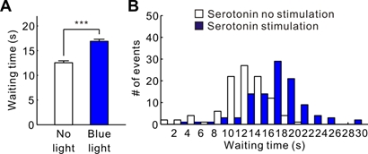 Figure 3.2.4: (A) The mean waiting time during the omission trials in serotonin no stimulation or in serotonin. (B) The distribution of the waiting times during the omission trials in (A). ***p < 0.001.