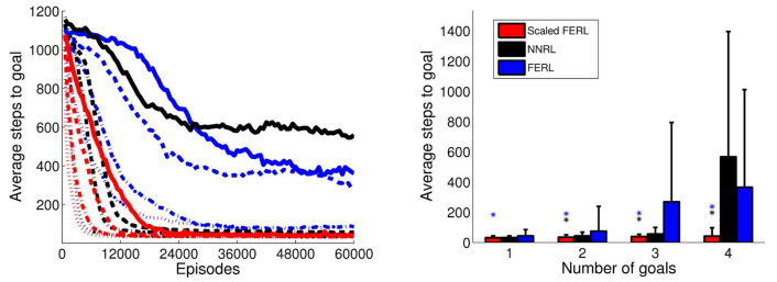 Figure 12: The average number of time steps to goal for the whole learning process (left panel) and in the final 100 episodes (right panel), for the four experiments with 1, 2, 3, and 4 goal areas. The average values were computed over every 100 episodes and 10 simulation runs in each experiment. In the left panel, the line type indicates the number of goals: dotted lines for 1 goal, dash-dotted lines for 2 goals, dashed lines for 3 goals, and solid lines for 4 goals. The colored asterisks in the right panel indicate experiments in which the final average performance of scaled FERL was significantly better (p < 0 . 001) than NNRL (black) or FERL (blue).