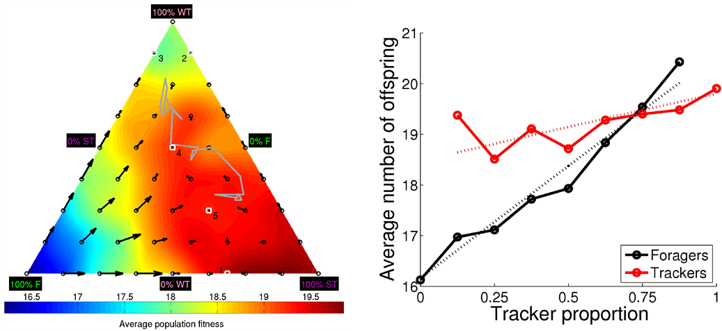 Figure 3.3.2: DiFinetti diagram of the directions and magnitudes of the changes in subpopulation proportions for the three phenotypes, strong stayers (SS), weak stayers (WS), and roamers (R). The small blue circles indicate the tested phenotype proportions. The red arrows show the average direction and magnitude of the change in phenotype proportions (magnified by a factor of five for visualization purposes). The green line, starting in the black circle and ending in the black triangle, shows the phenotype proportions in final 20 generations of the evolutionary experiments. The gray-scale coloring visualizes the average population fitness.