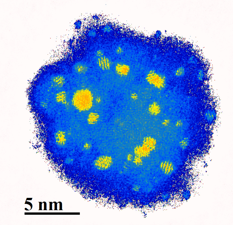 Figure. 3.3. The yellow areas in this image are Silver nanoclusters, which have monocrystalline structure and are used to induce crystallinity in an amorphous Silicon nanoparticle, the blue area.