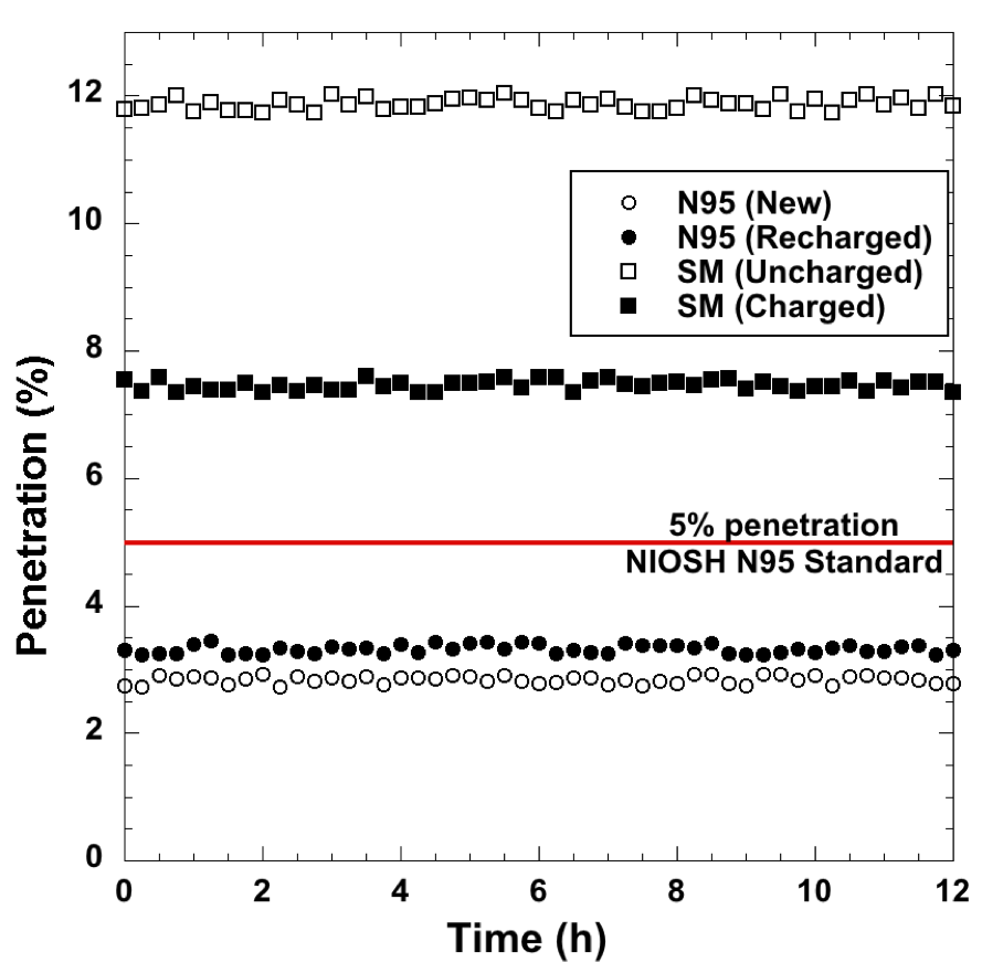 Figure 15: Penetration (%) versus time (h) over 12 hour duration for a new commercial N95 FR (black unfilled circles), intentionally discharged and then CDT recharged N95 FR (black solid circles), a new commercial surgical mask (SM) (black unfilled squares) and a post-CDT surgical mask (black solid squares). The NIOSH mandated N95 standard's penetration value is shown as a solid red line at the 5% mark.
