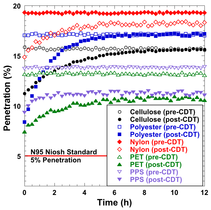 Figure 16: Penetration (%) versus time (hours) for knitted cloth FMs pre- (open symbols) and post-CDT (filled symbols): Cellulose (black circles), Polyester (blue squares), Nylon (red diamonds), PET (green upright triangles), and PPS (purple inverted triangles).