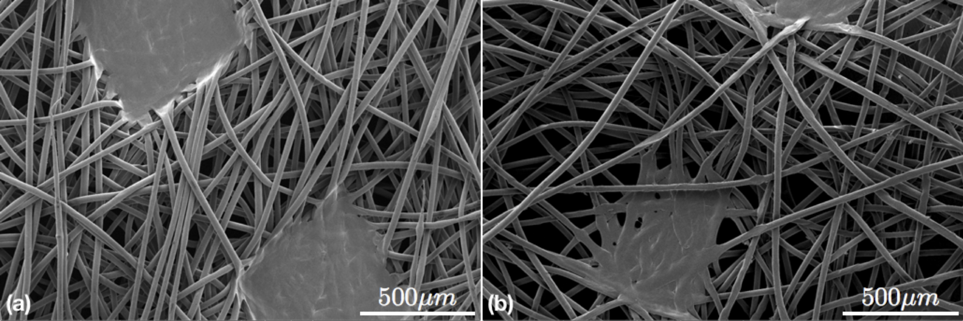 Figure 7: (a) Scanning Electron Micrograph for pre-CDT commercial surgical mask with high quality polymer fibers. (b) The same surgical mask post-CDT when the discharge sparks and flames were at least 3 cm away from the mask surface reveals degradation from local, microscopic melting or fraying of polymer fibers.