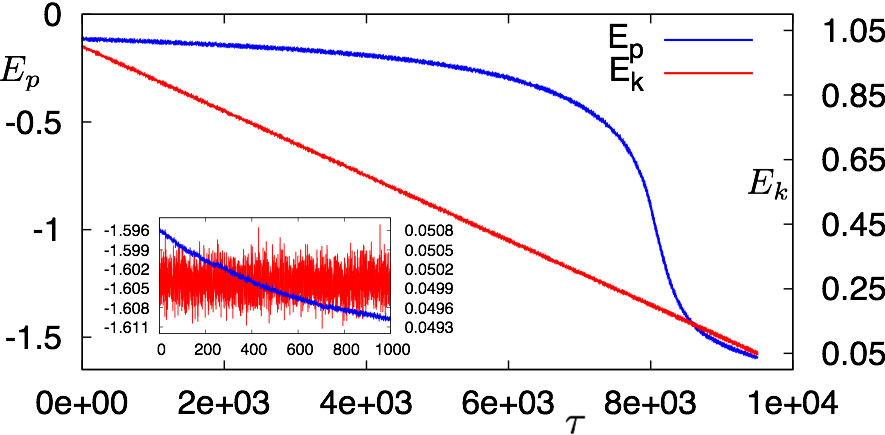 Fig.2 Evolution of potential energy per particle (left Y-axis) and bulk temperature (right Y-axis) have been plotted against simulation time during the slow cooling down of our model system described in the text. During linear ramp-down of bulk temperature, potential energy per particle shows abrupt decay at a temperature which coincides with the liquid-gas critical temperature of bare attraction potential considered.This observation is independent of the repulsion length used in our simulation. After reaching desired temperature T = 0.05 by cooling temperature is held fixed as shown in inset, however, the potential energy continues to decay within the observation time indicating the non-equilibrium state of the system.