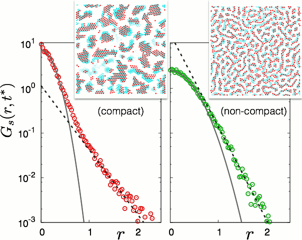 (left panel) Probability of finding a particle at a distance 'r' and time 't=t*' from its position at 'r=0' and 't=0' is plotted for a compact crystalline configuration shown in the inset. As individual particles are always caged by their nearest neighbours, the probability is dominantly Gaussian (within cage) with an exponential tail (escape from cage). In the inset, the red dots represent instantaneous position of particles, say, at time 't*'; the background blue region represent the trajectory of all these particles from 't=0' upto 't*'.