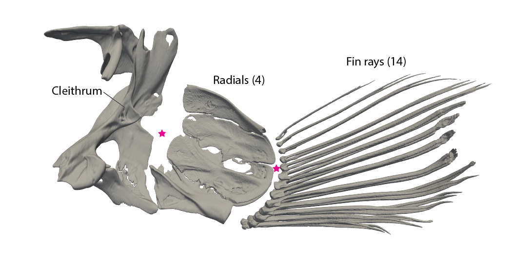 Figure 2: 3D reconstruction of a typical mudskipper pectoral fin (Periophthalmus argentilineatus) showing calcified elements such as shoulder girdle, radials and fin rays (from left to right). The unique anatomical features in the skeletton of the mudskipper pectoral fin comprise of two movable hing joints (pink stars), an elongation of the proximal radials and an enlarged cleithrum to provide larger surface area for muscle attachment (i.e. increased force generation).