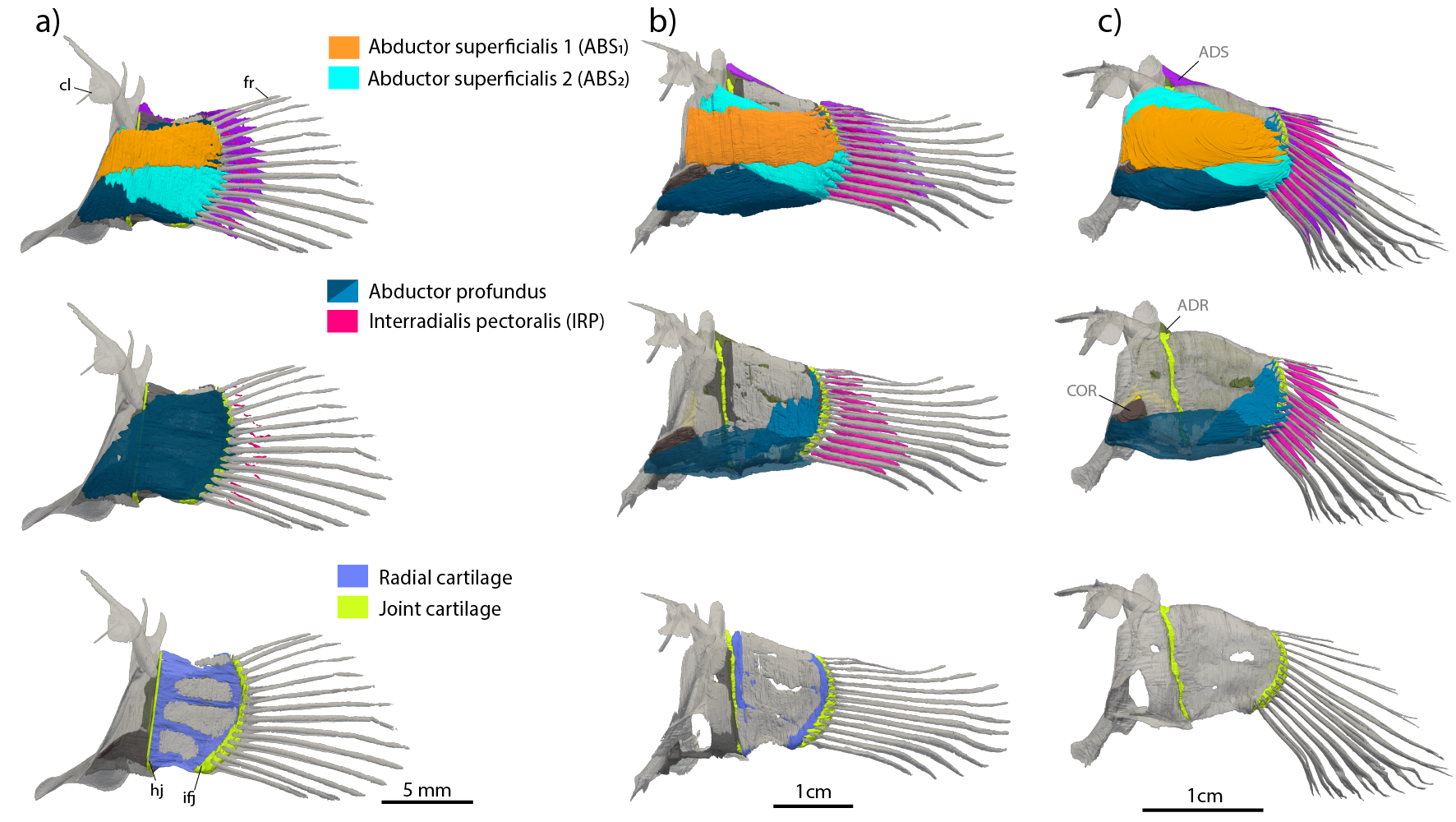 Figure 2: 3D rendered anatomy of mudskipper pectoral fin showing muscular composition in a) late stage larva, b) newly metamorphosed juvenile and c) adult P. argentilineatus.