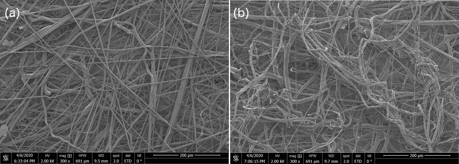 Figure 7: Scanning Electron Microscopy (SEM) Micrograph images for OIST-made and commercial N-95 electrocharged layer sample at 200 micron resolution shows no discernible structural differences between the two samples. We are not specifying which of (a & b) are OIST-internal versus commercial N95 sample SEMs.
