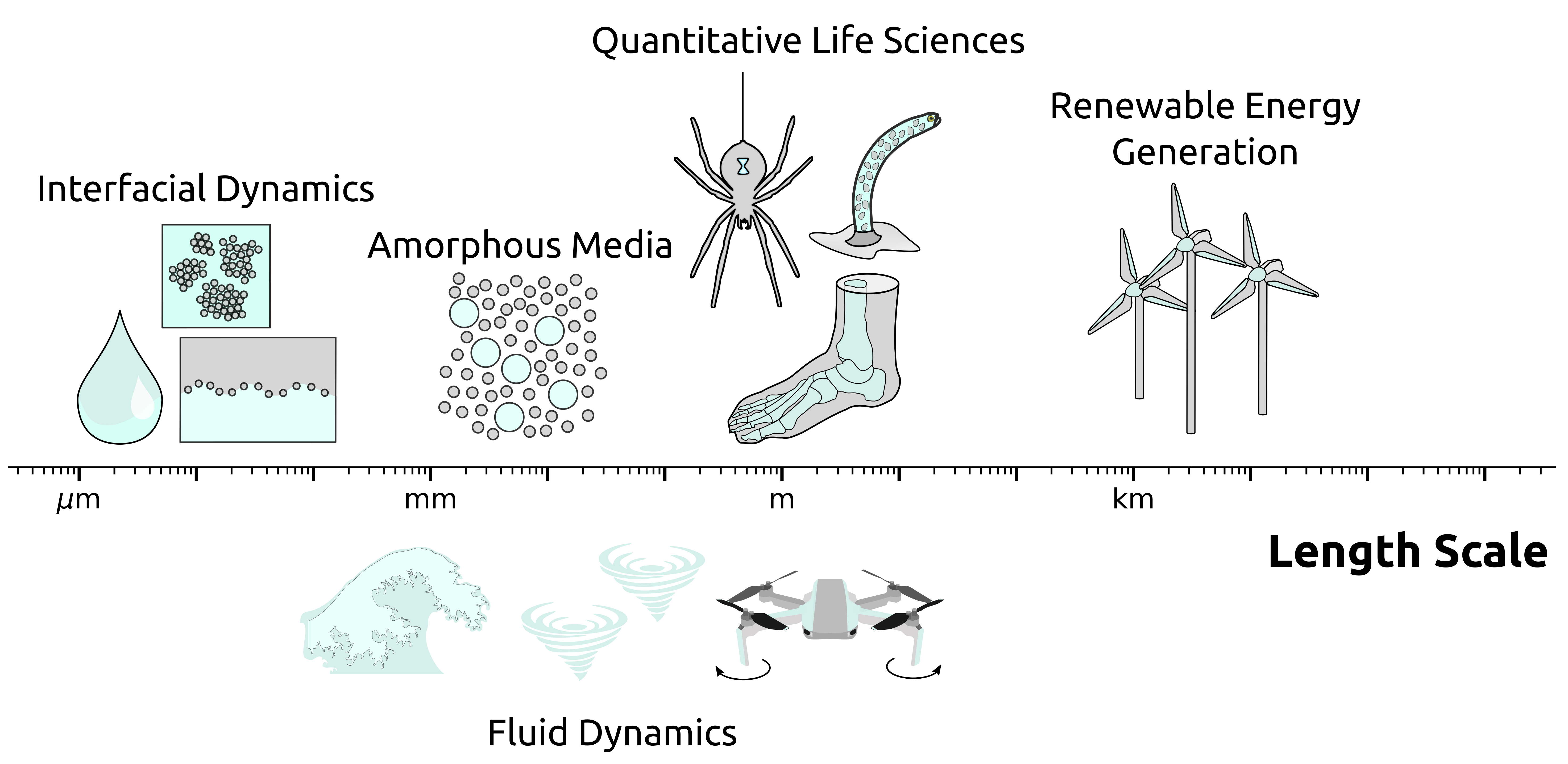 Diagram of the various length scales at which we study natural phenomena.