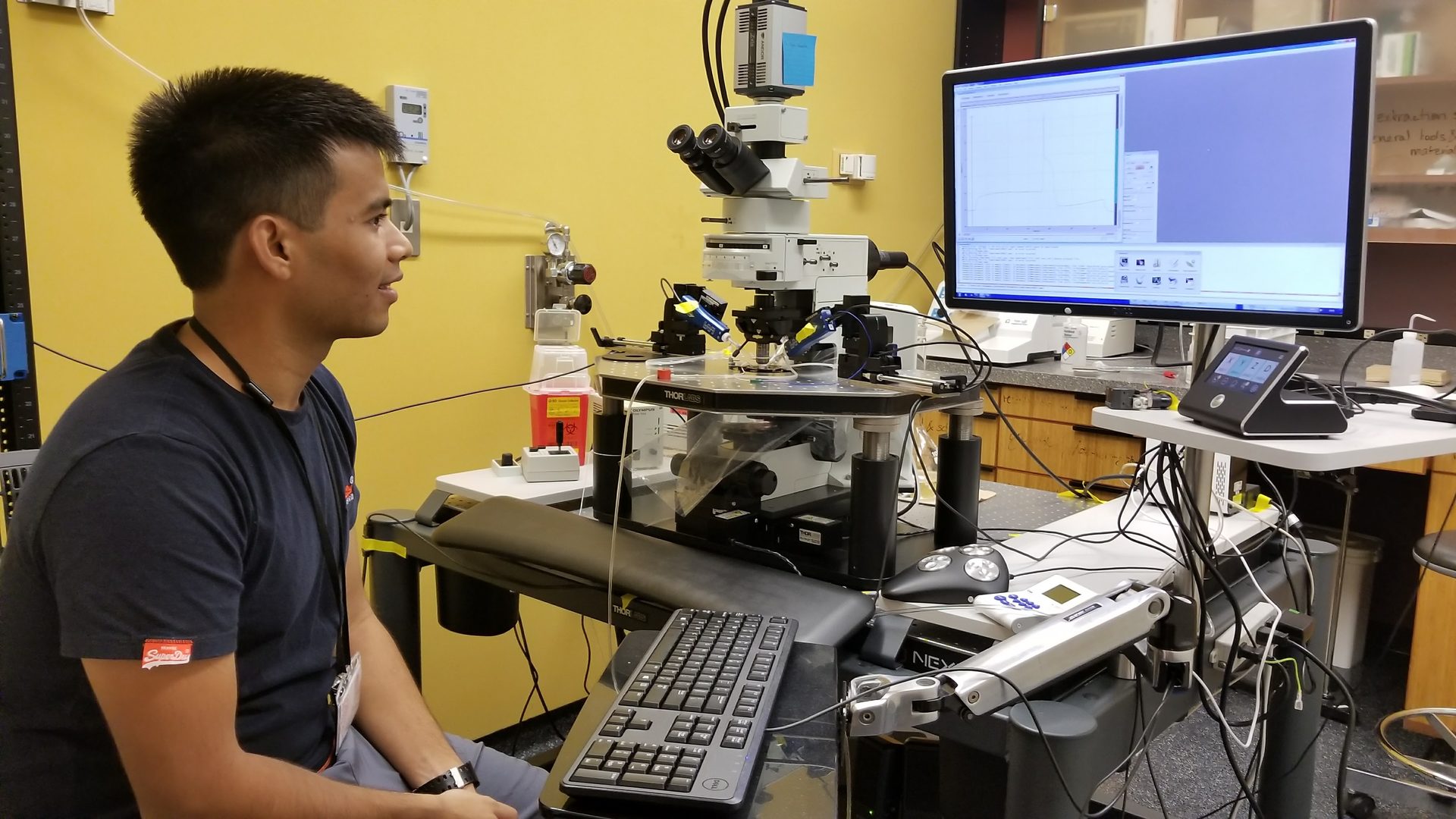 Figure 2: Dr. Alex Tang setting up slice electrophysiology system