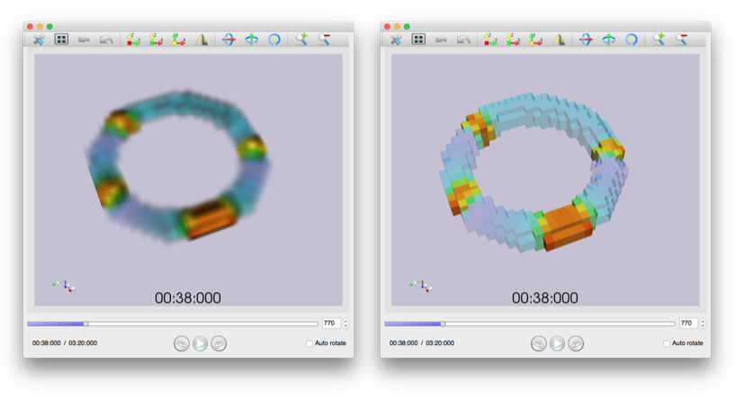 Figure 2:  PhysioVisualizer snapshot. Left: the visualization with normal rendering method.  Right: with clear-voxel mode.