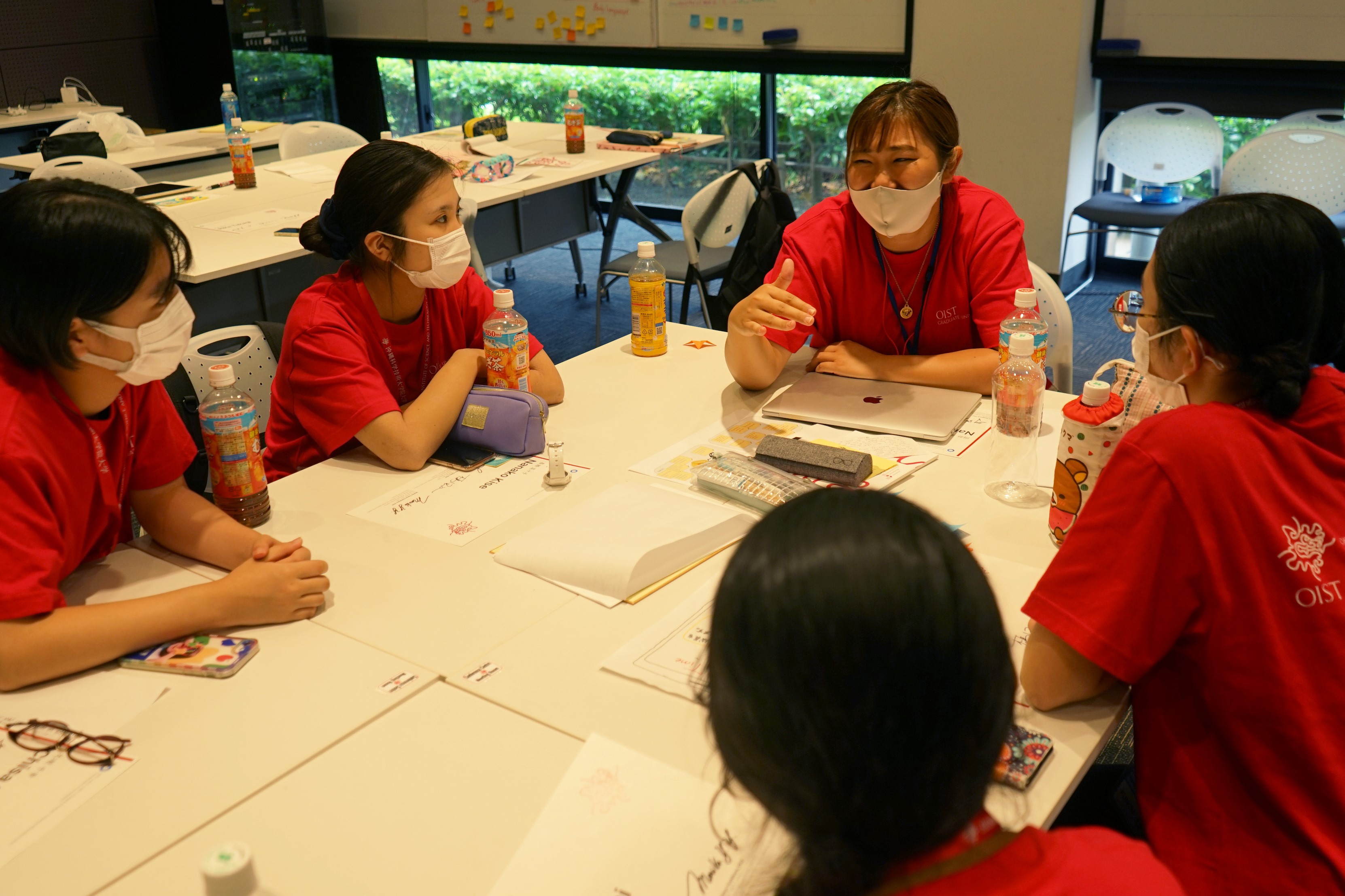 Nanako Okabe (left) and Nanami Tomoda (right), OIST PhD students, serve as the bilingual design coaches to mentor and support the high school girls during the workshop.