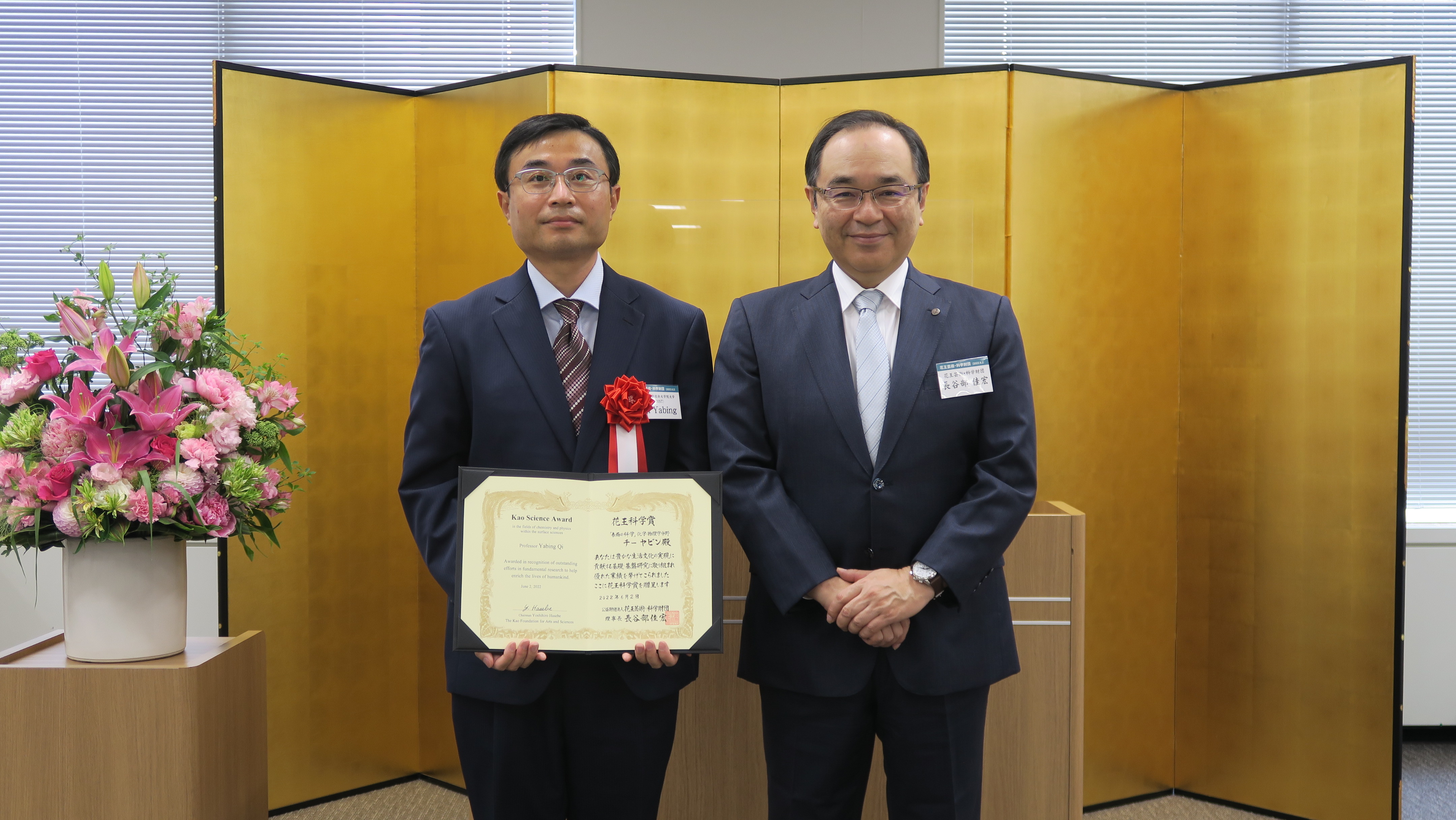 OIST Professor, Dr. Yabing Qi (left) displays the Kao Science Prize certificate, along with Yoshihiro Hasebe, President of The Kao Foundation for Arts and Sciences (right).