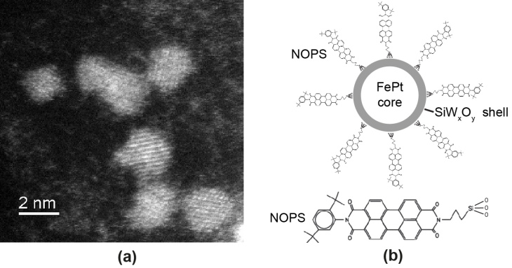 Figure 7: HR-TEM image of magnetic FePt core-shell nanoparticles, however, the shell is not visible without averaging (a). Tungsten oxide covering the surface of the crystalline nanoparticles causes dispersibility in polar solvents like EtOH and water but also allows functionalization as, for example, labeling with the fluorescence dye NOPS as illustrated schematically in (b).
