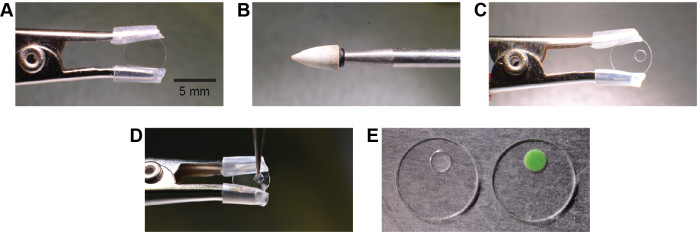 Figure 1: Manufacturing of a chronic cranial window with access port. A round glass cover slip is clamped by a crocodile clamp with silicone tube cover (A). A conical stone drill bit (B) is used to grind a circular hole off-center into the glass cover slip (C). The hole is filled with silicone which is applied by a metal drill bit (D). Different silicone types have different features like transparency and stiffness (E). The image shows a Sylgard (left) and a Kwik-Cast (right) filled access port.