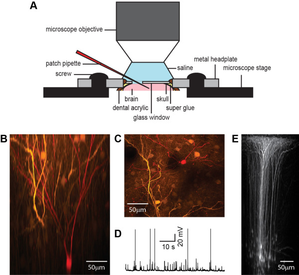 Figure 3: After removing the silicone plug single neurons can be targeted by patch clamp experiments (A-D). The access port also does not impair imaging. As an example we show layer 5 pyramidal neurons in barrel cortex of mouse imaged through a window with silicone access port (E).