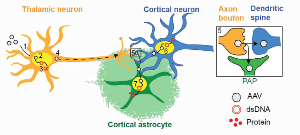 We showed that adeno-associated viruses (AAVs) enter and transfect neurons (1-3) but also travel along the axon (4) and transfer to neurons and astrocytes (5) and transfect these cells (6,7).