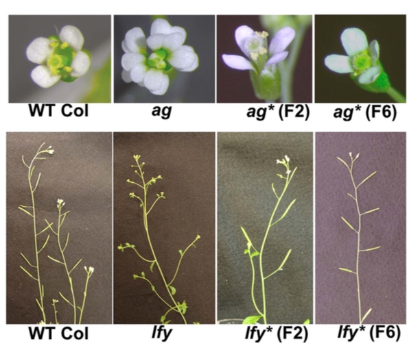 Figure 1: Suppression of T-DNA inserted in AGAMOUS (AG) and LEAFY (LFY) genes. The suppressed ag* and lfy* plants show wild-type flower phenotype even though the presence of >8 kb T-DNA insertion in introns. These suppressions are restored in ibm2 background.