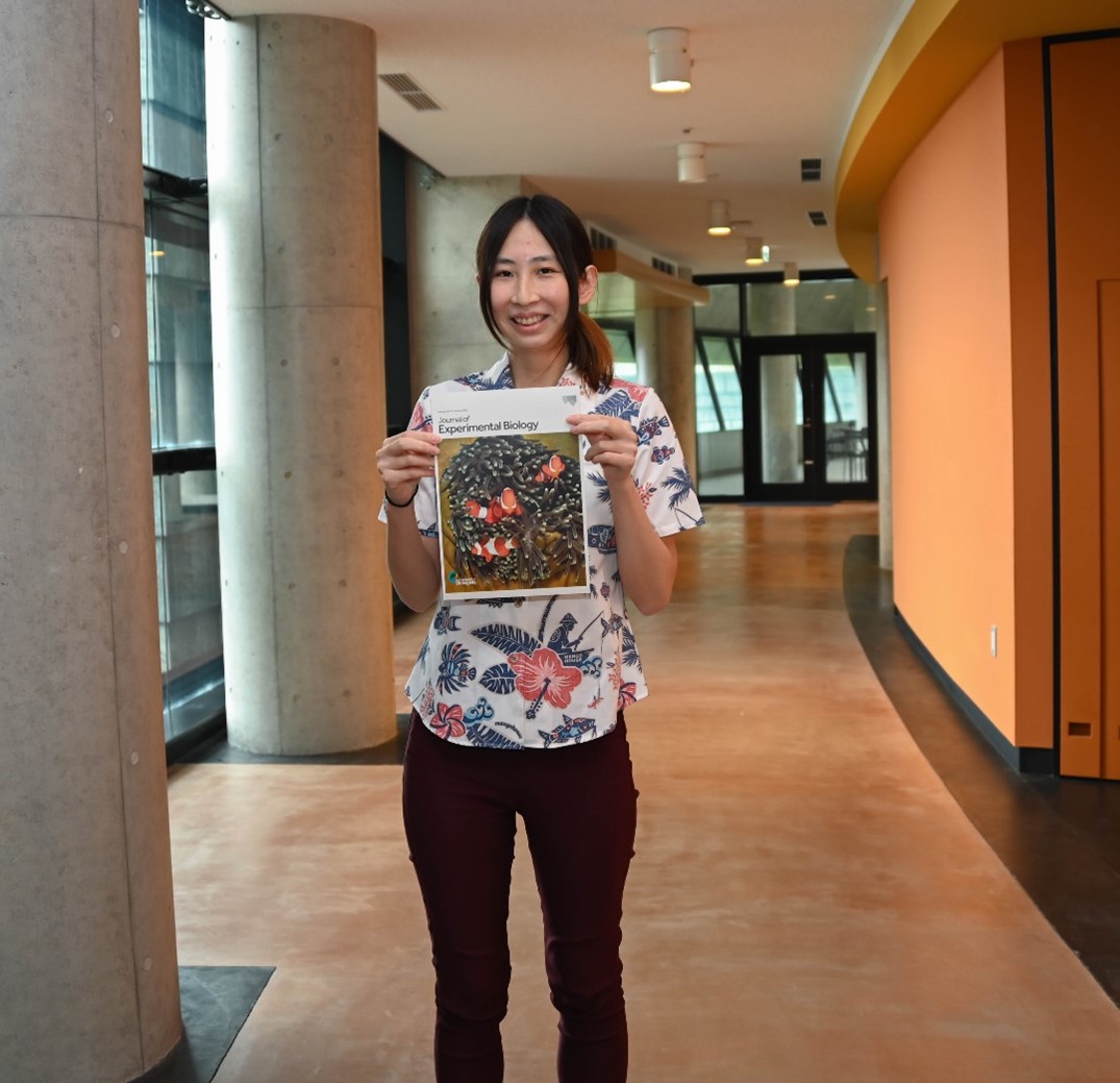 研究論文が掲載された科学誌『Journal of Experimental Biology』の表紙を持つ海洋生態進化発生生物学ユニットの林希奈博士。表紙の写真はPascal Kobehによるもの。写真提供:エイドリアン・スコウ/OIST