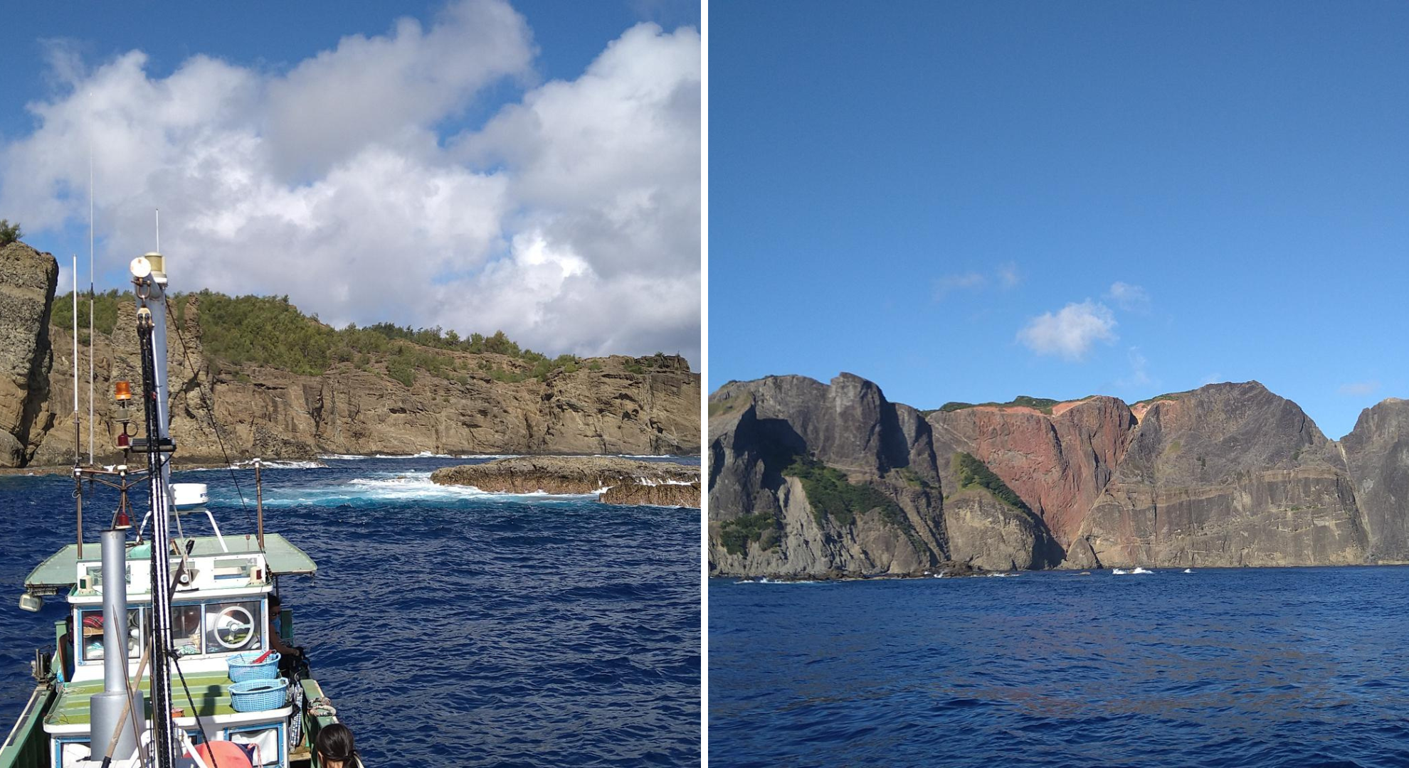 Photos of research vessel used to survey the Ogasawara Islands and Heart Rock on Chichi Island