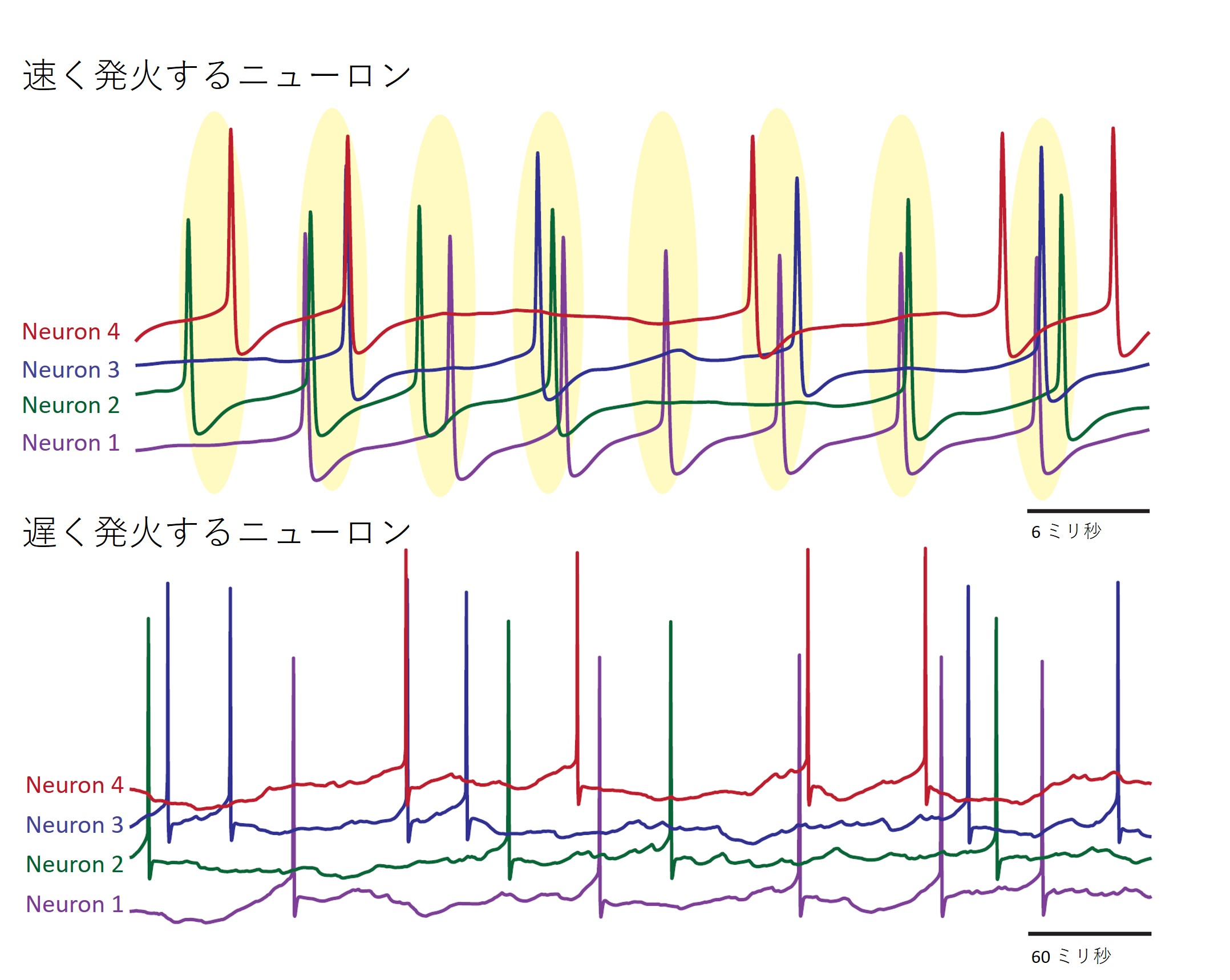 When a group of Purkinje neurons fire rapidly, loose synchronization occurs. This can be seen by the spikes occurring in groups at regular intervals (highlighted in yellow). When Purkinje neurons fire slowly, this synchronization does not occur.