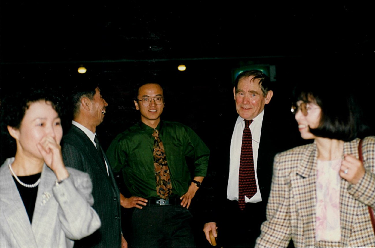 Professor Maruyama (center left) and Professor Sydney Brenner (center right) in Cambridge.